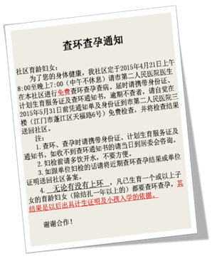 最近,一位网友翻拍了社区要求已经生育过子女的育龄妇女“查环”通知,分享在微博里,被许多人转发。引发共鸣的原因是通知上写着查环结果“是以后出具计生证明及小孩入学的依据”。